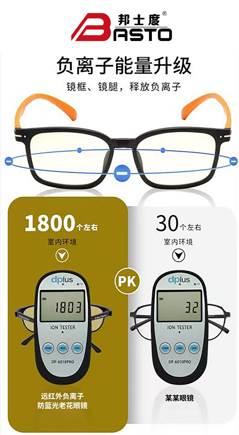 2. 负离子:实用专利用天然电气石《地学前缘》验证的纳米粉体嵌入镜框特殊纳米级材料与工艺特色,持续释放高浓度负离子,抑制细菌、缓解视疲劳。